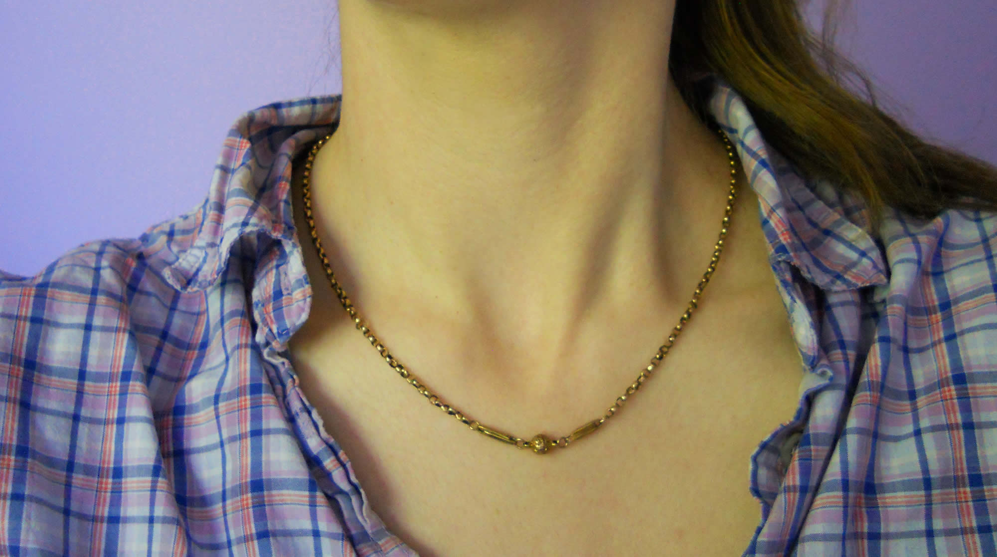 This lovely 19 inch necklace will look beautiful with other chains and charms! Equally great by itself. It comprises chunky belcher links, with an ornate ball to the centre and double bar links to each side of that. It is fitted with a barrel clasp.