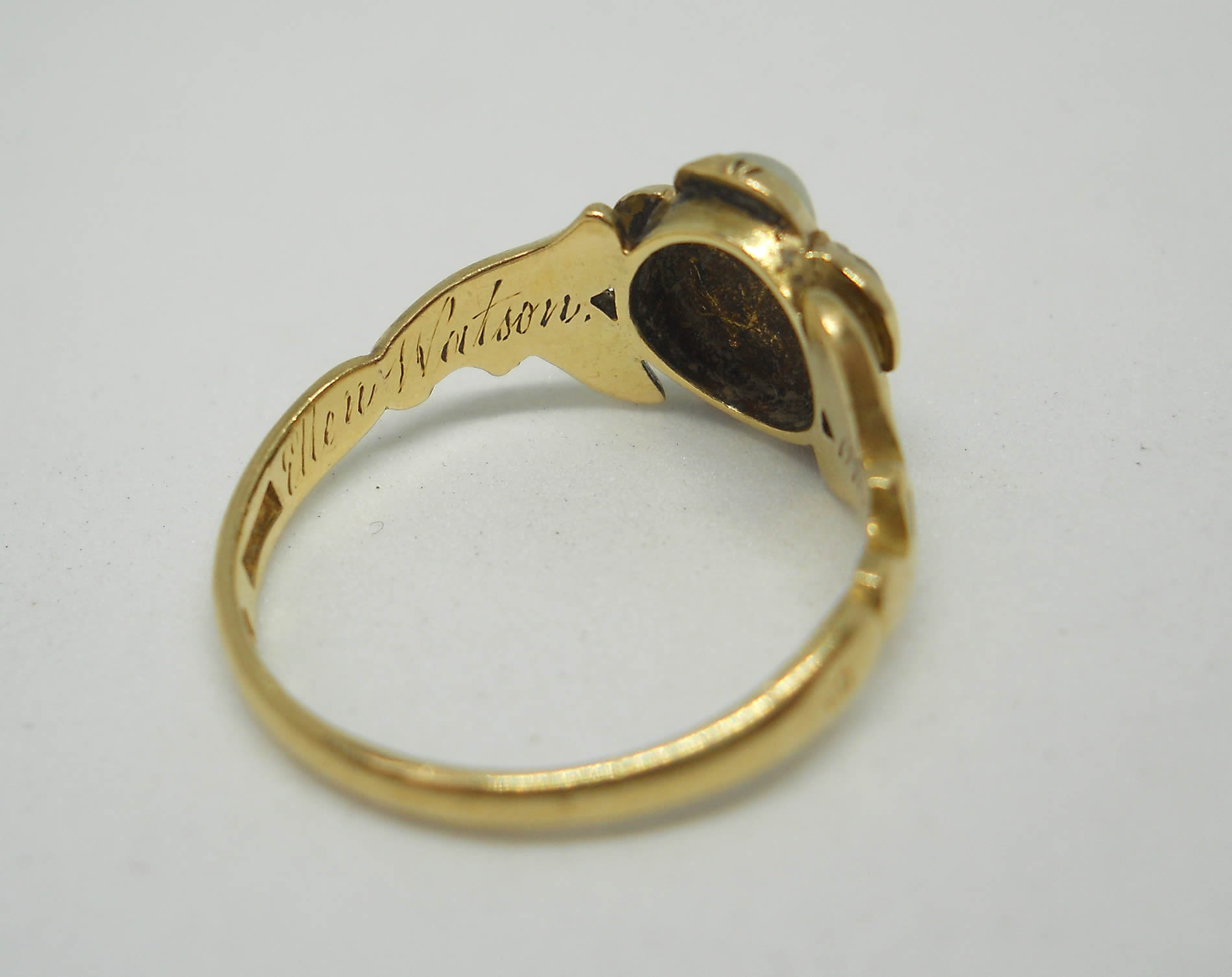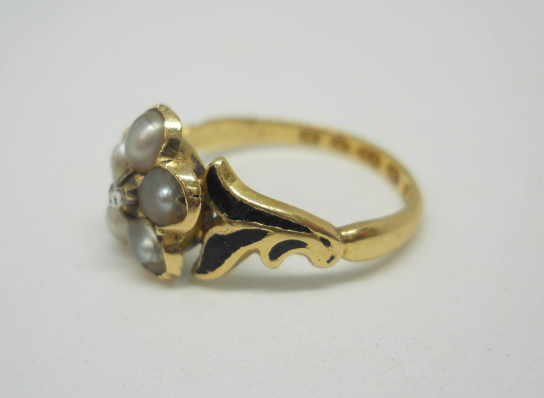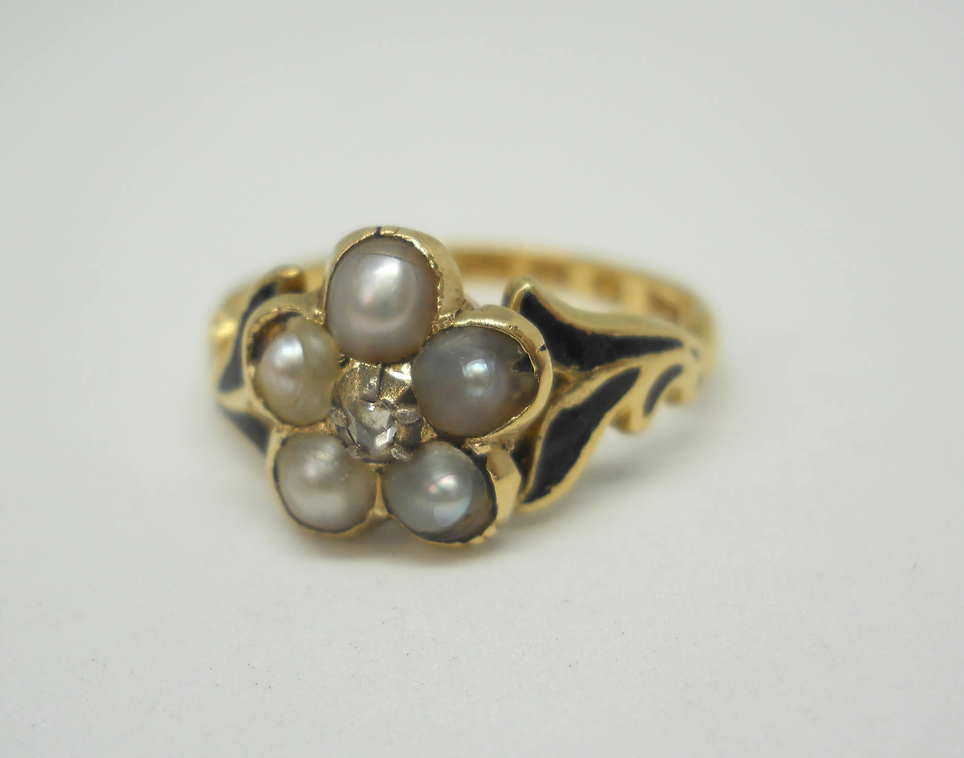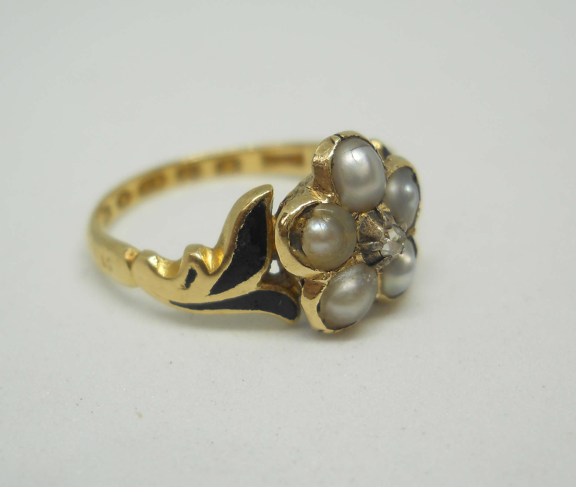 The jewellery of our predecessors doesn’t come any sadder or sweeter than this little flower. At the centre sits a lovely rose cut diamond held in tiny silver claws, as was the custom of the era. Five luminous silvery pearls sit around it to form a pansy, which according to the jewellery language of the time indicated the wearer was dwelling in her thoughts. Inside the band we learn why, as here is the inscription, “Ellen Watson ob 30, april 1846“. The full set of crisp hallmarks, which include the duty mark, confirm the ring was made in 1846, no doubt commissioned by Ellen’s daughter or sister when they were in mourning for her death. The delicate, leaf-like shoulders have lovely black enamel detailing for a gothic look that feels really edgy today. The flower measures around 8.2mm with a rise of 4mm. The shoulders taper to a band of 1.8mm. The date letter has been struck seemingly by accident on the outside of one shoulder. The flower has space for a locket behind it, now vacant.