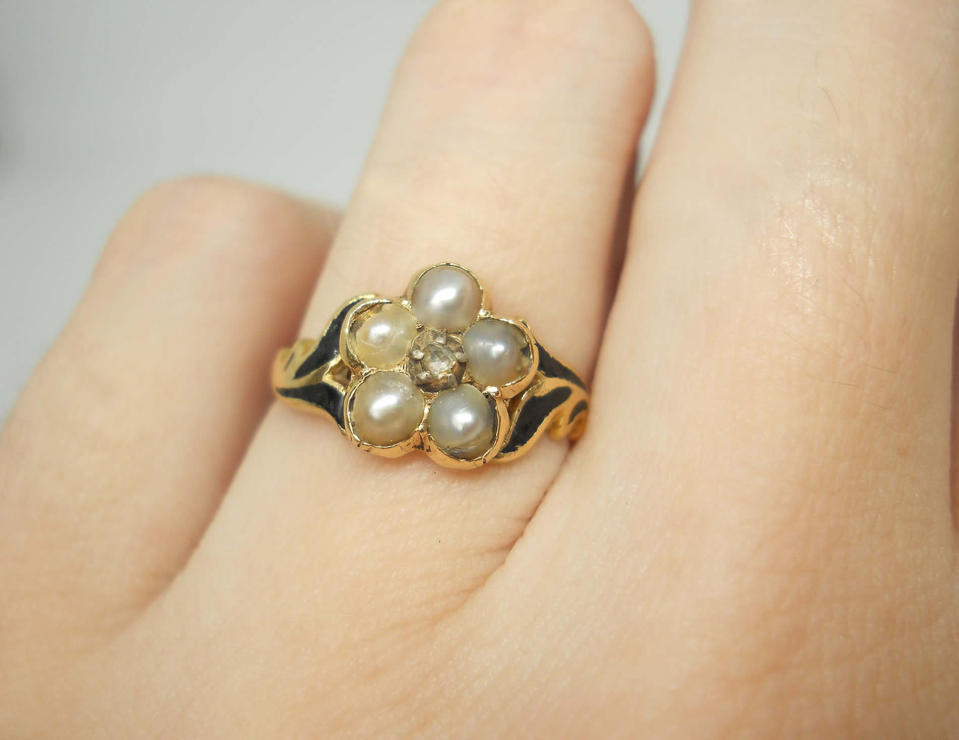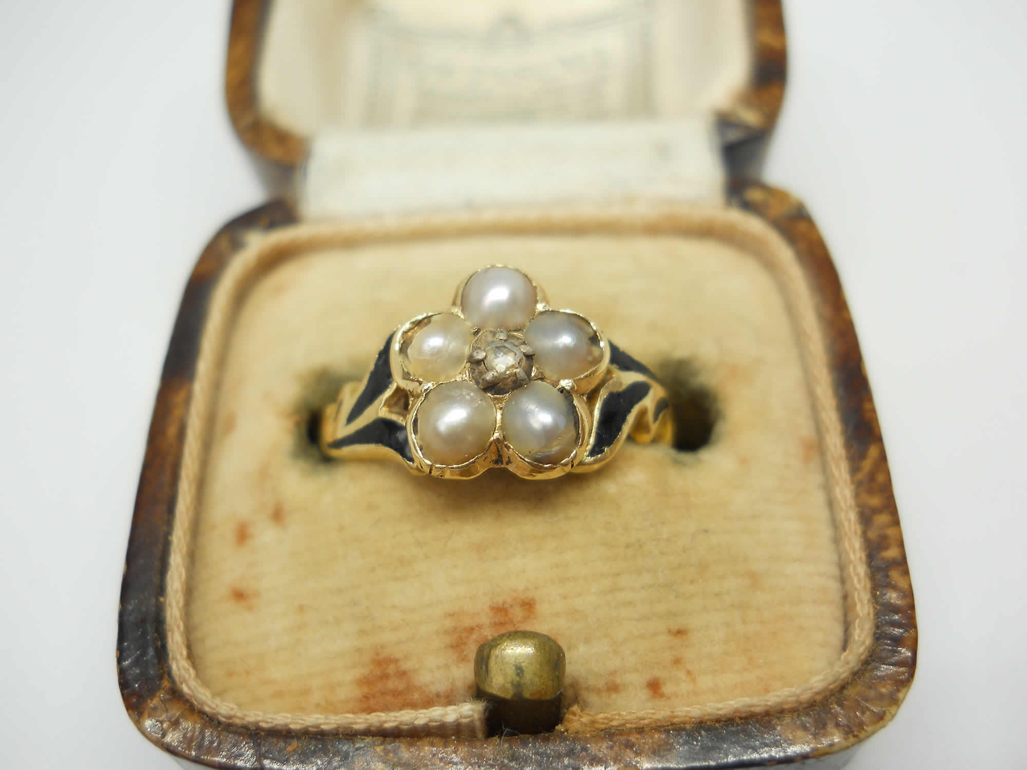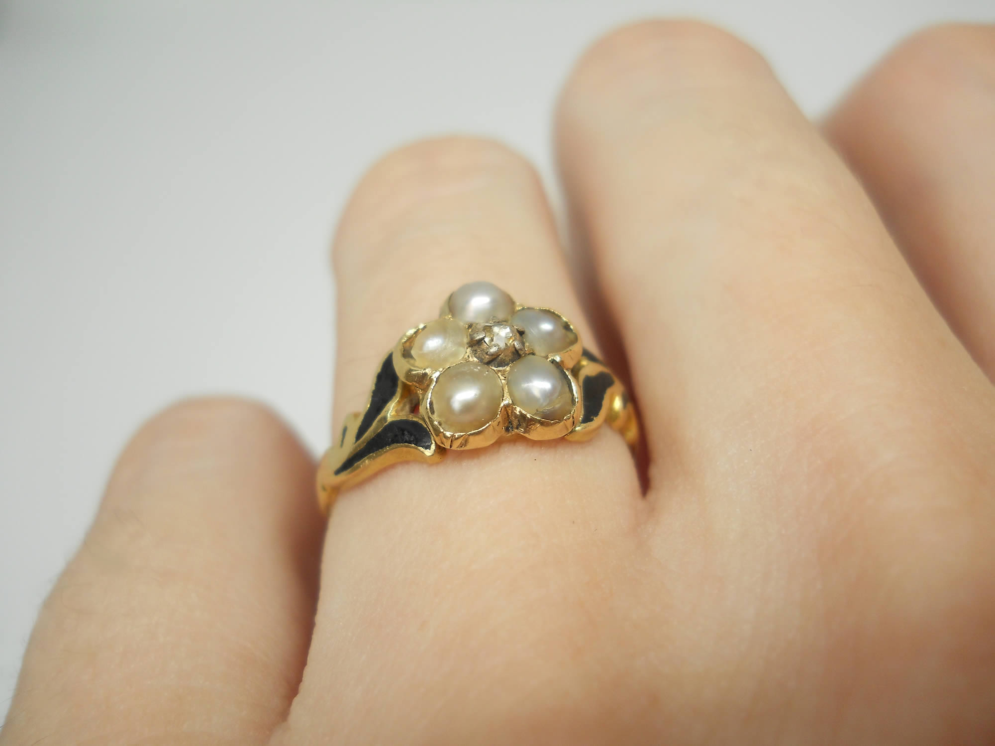 The jewellery of our predecessors doesn’t come any sadder or sweeter than this little flower. At the centre sits a lovely rose cut diamond held in tiny silver claws, as was the custom of the era. Five luminous silvery pearls sit around it to form a pansy, which according to the jewellery language of the time indicated the wearer was dwelling in her thoughts. Inside the band we learn why, as here is the inscription, “Ellen Watson ob 30, april 1846“. The full set of crisp hallmarks, which include the duty mark, confirm the ring was made in 1846, no doubt commissioned by Ellen’s daughter or sister when they were in mourning for her death. The delicate, leaf-like shoulders have lovely black enamel detailing for a gothic look that feels really edgy today. The flower measures around 8.2mm with a rise of 4mm. The shoulders taper to a band of 1.8mm. The date letter has been struck seemingly by accident on the outside of one shoulder. The flower has space for a locket behind it, now vacant.