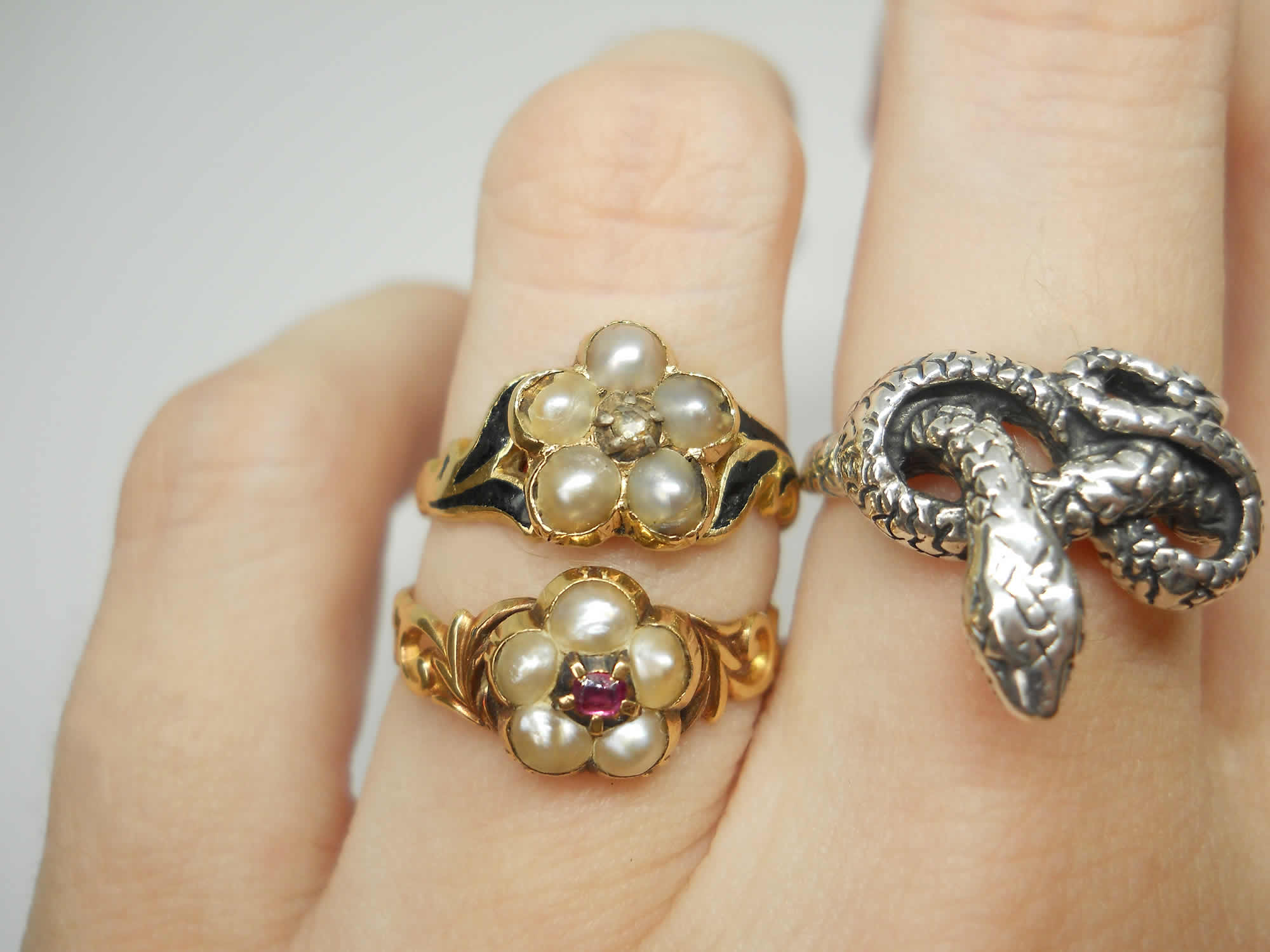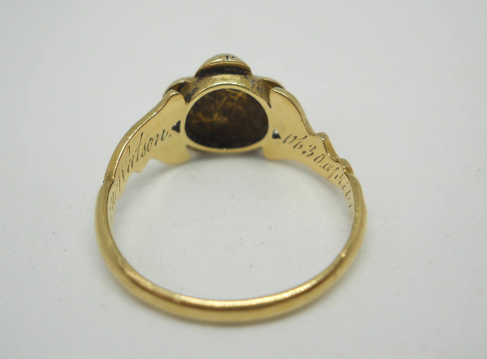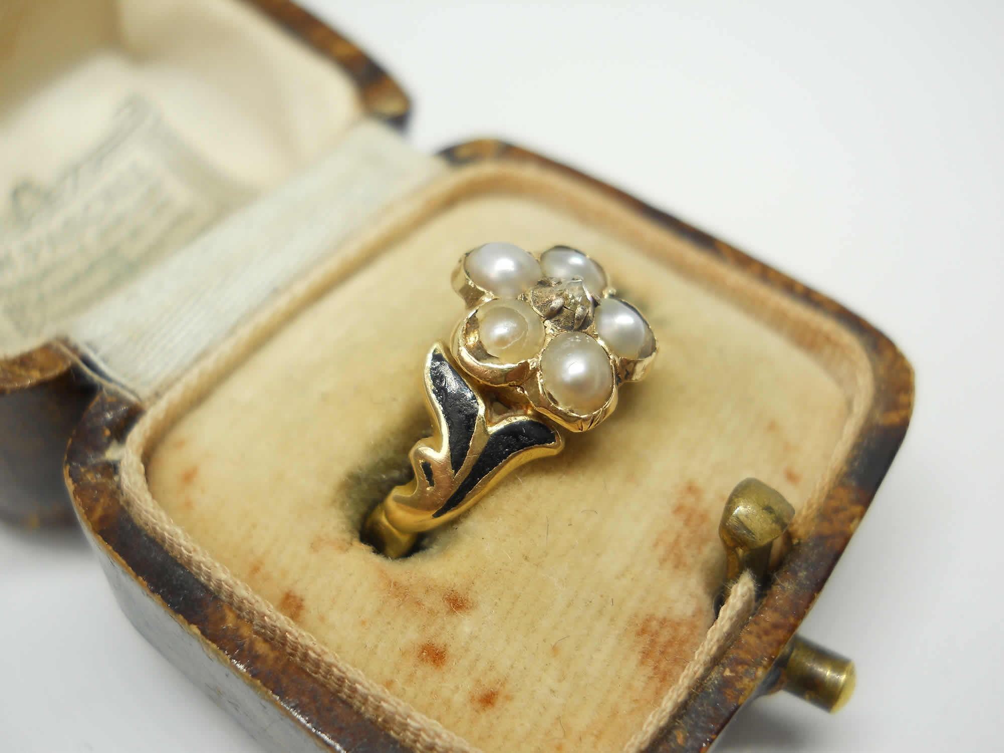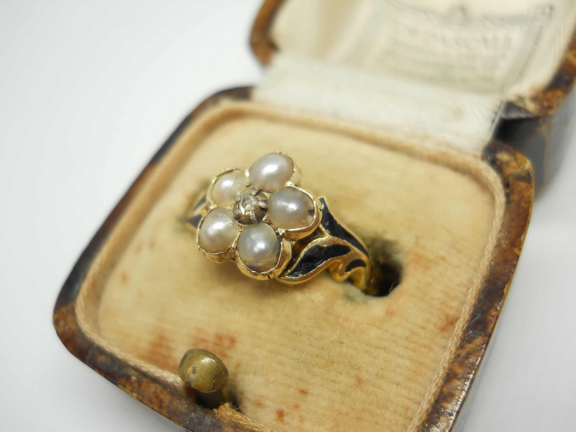 The jewellery of our predecessors doesn’t come any sadder or sweeter than this little flower. At the centre sits a lovely rose cut diamond held in tiny silver claws, as was the custom of the era. Five luminous silvery pearls sit around it to form a pansy, which according to the jewellery language of the time indicated the wearer was dwelling in her thoughts. Inside the band we learn why, as here is the inscription, “Ellen Watson ob 30, april 1846“. The full set of crisp hallmarks, which include the duty mark, confirm the ring was made in 1846, no doubt commissioned by Ellen’s daughter or sister when they were in mourning for her death. The delicate, leaf-like shoulders have lovely black enamel detailing for a gothic look that feels really edgy today. The flower measures around 8.2mm with a rise of 4mm. The shoulders taper to a band of 1.8mm. The date letter has been struck seemingly by accident on the outside of one shoulder. The flower has space for a locket behind it, now vacant.