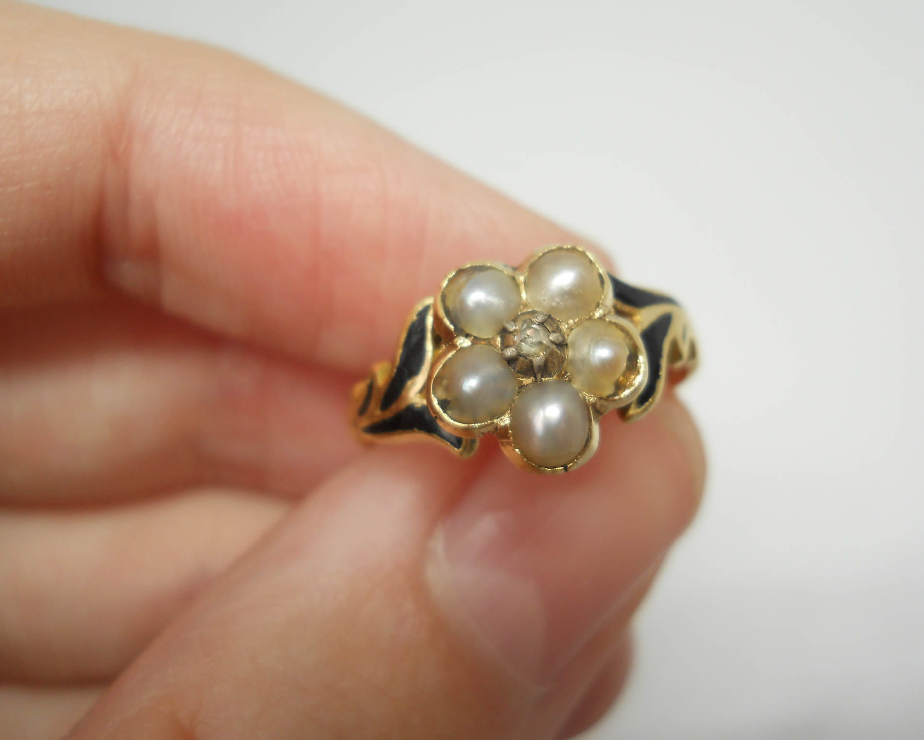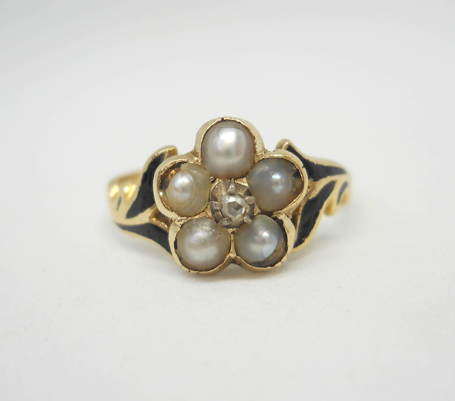 Diamond and pearl enamelled mourning ring