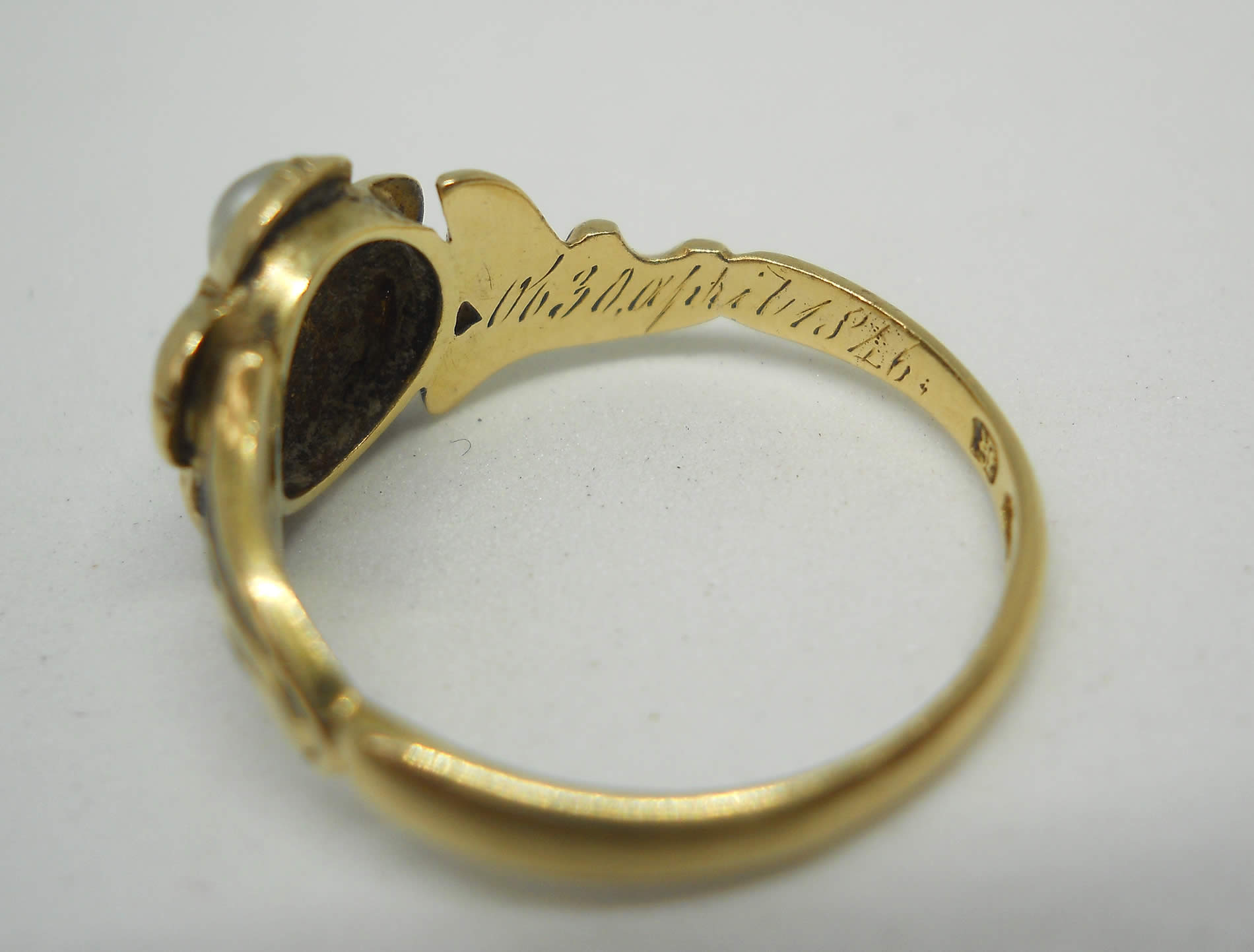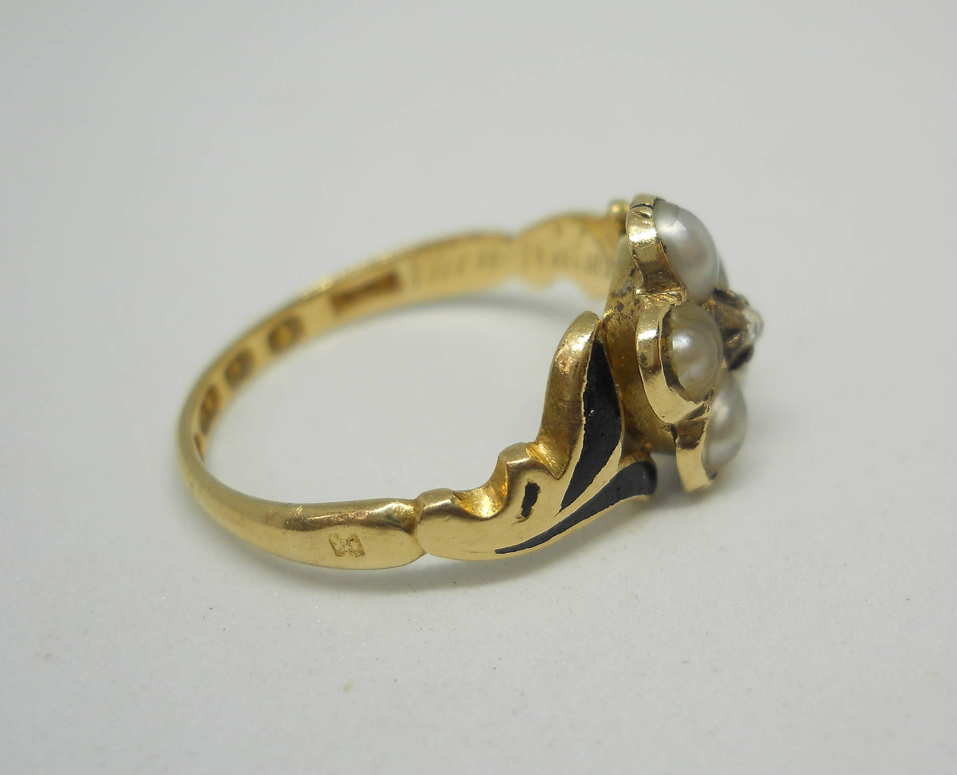 Victorian rose cut diamond and pearl black enamel 18ct gold mourning ring with inscription circa 1846
