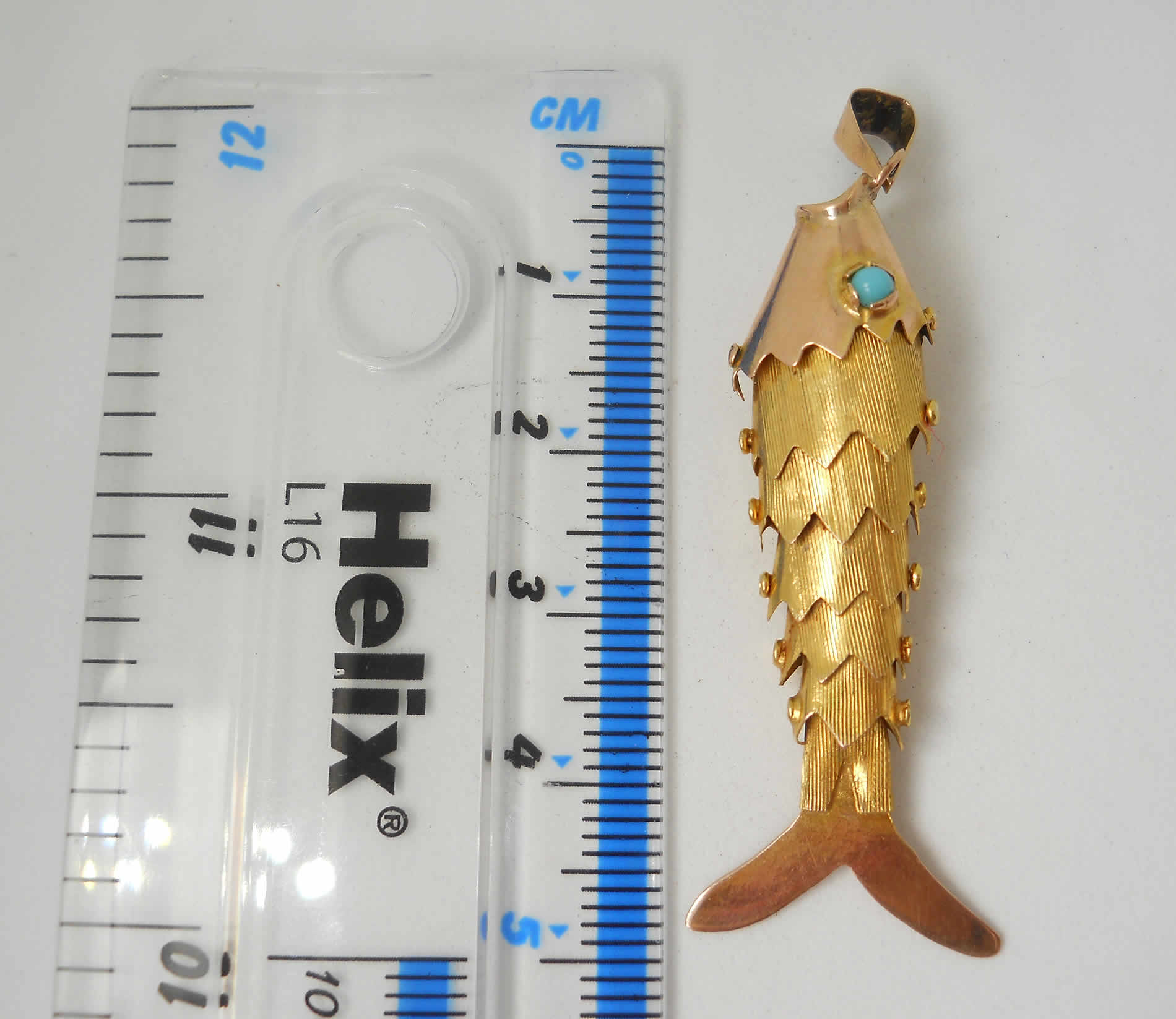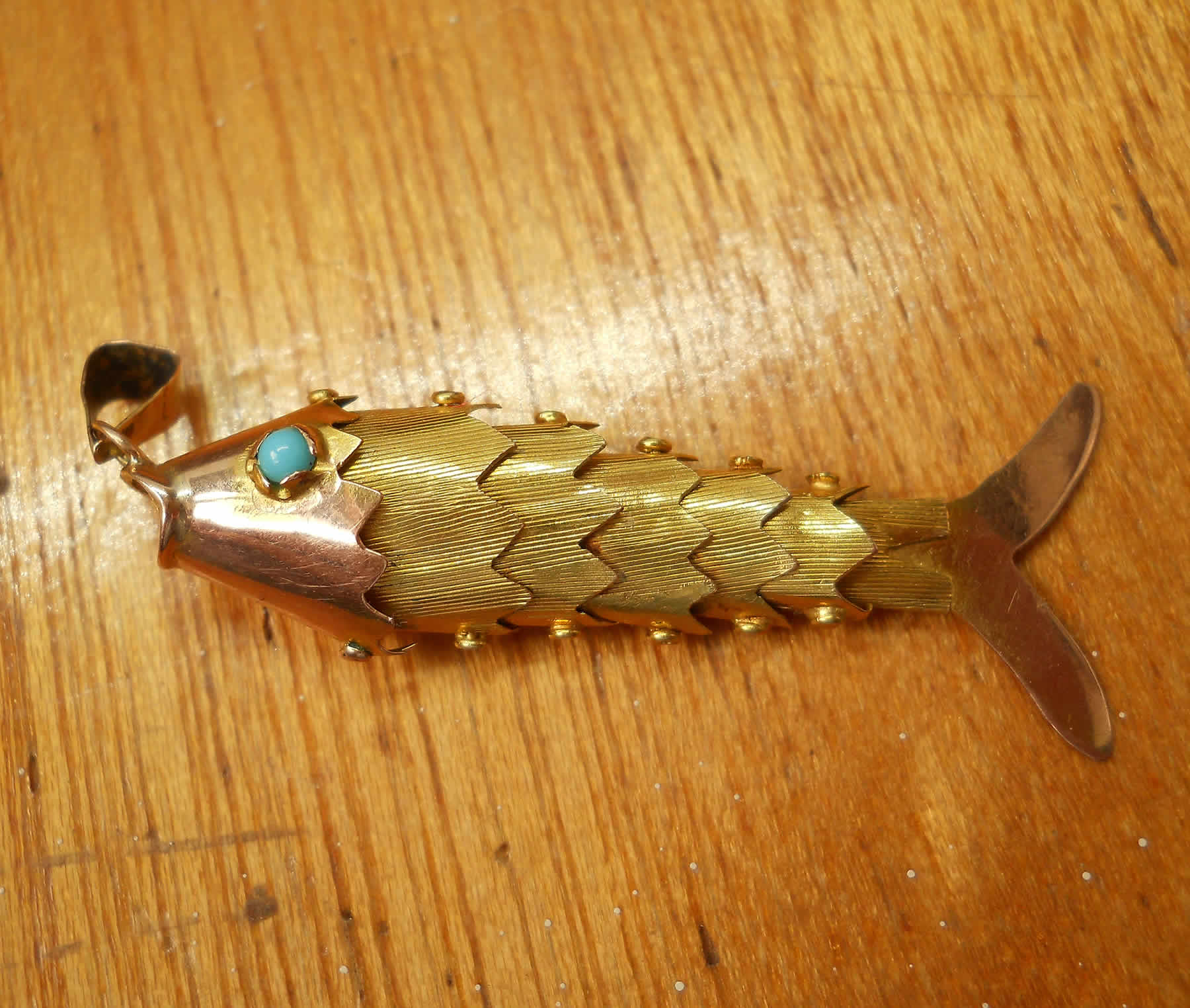 This imaginative and striking example is likely an import from Portugal. Its beautiful wiggling scales are realistically textured, and capture the movement of a real little fish. The body is in yellow gold, while the bail, head and tail are more pink in tone. The mouth is open in a perpetual gasp. The bail is set to one side so she will sit at an angle on your chain