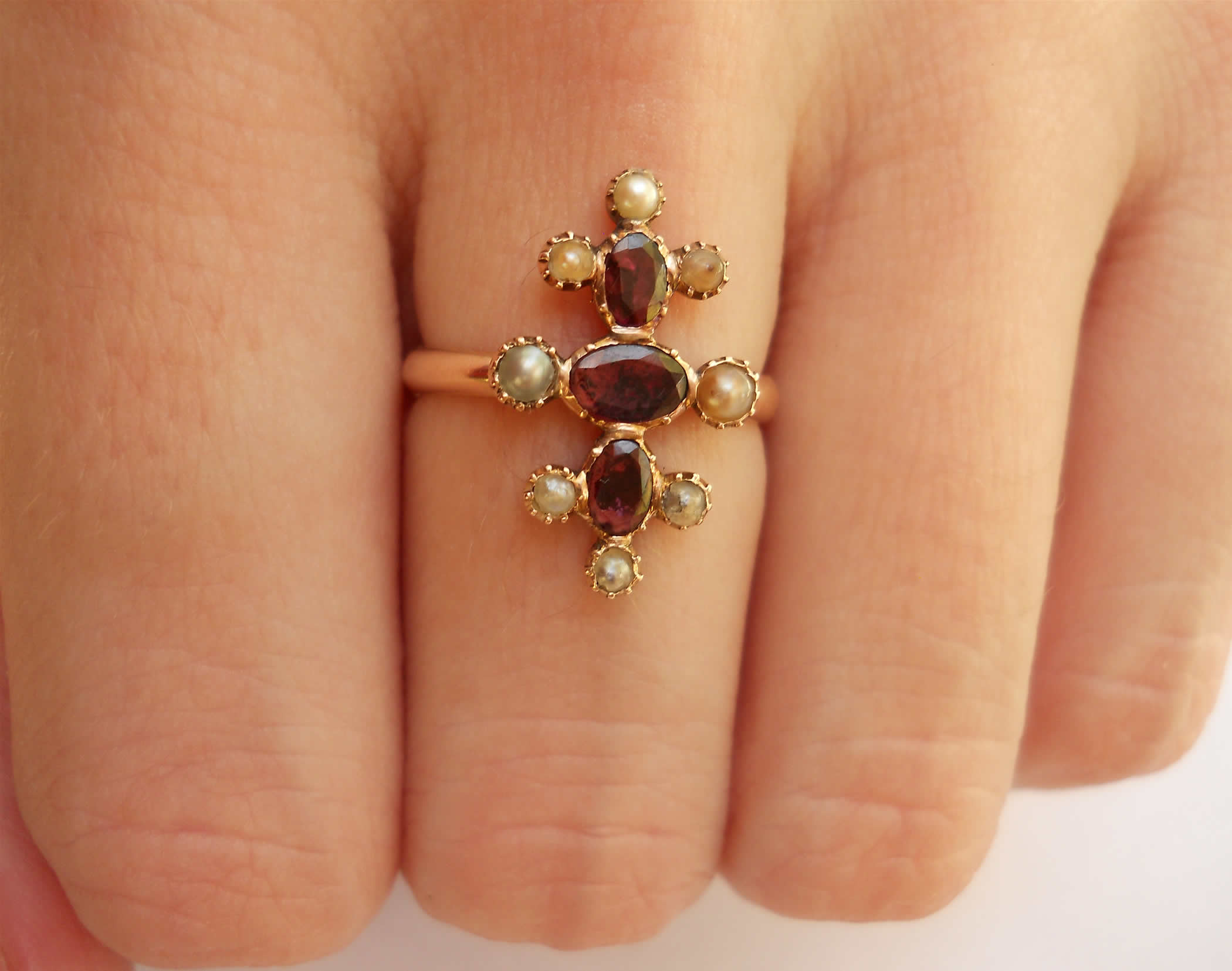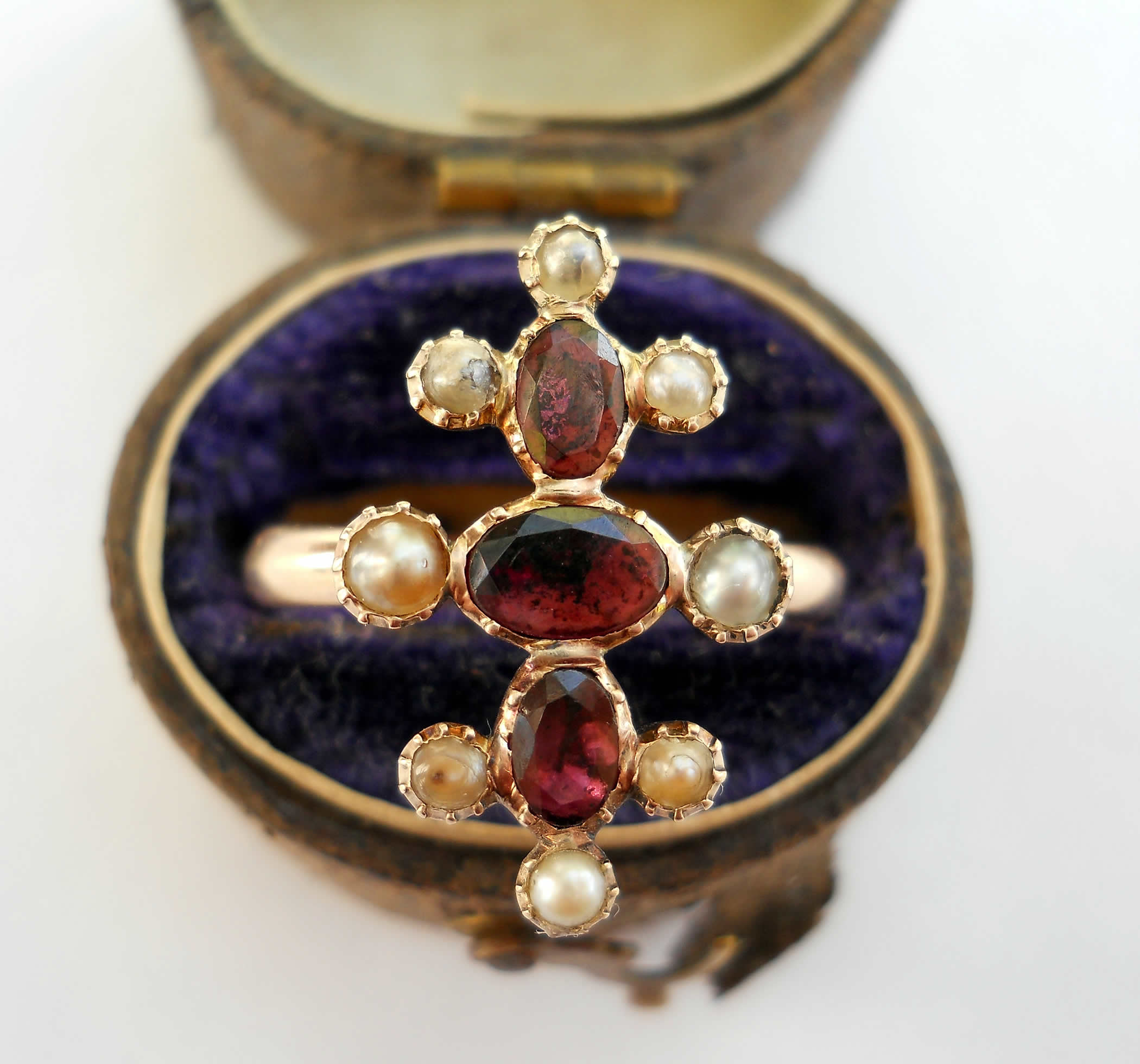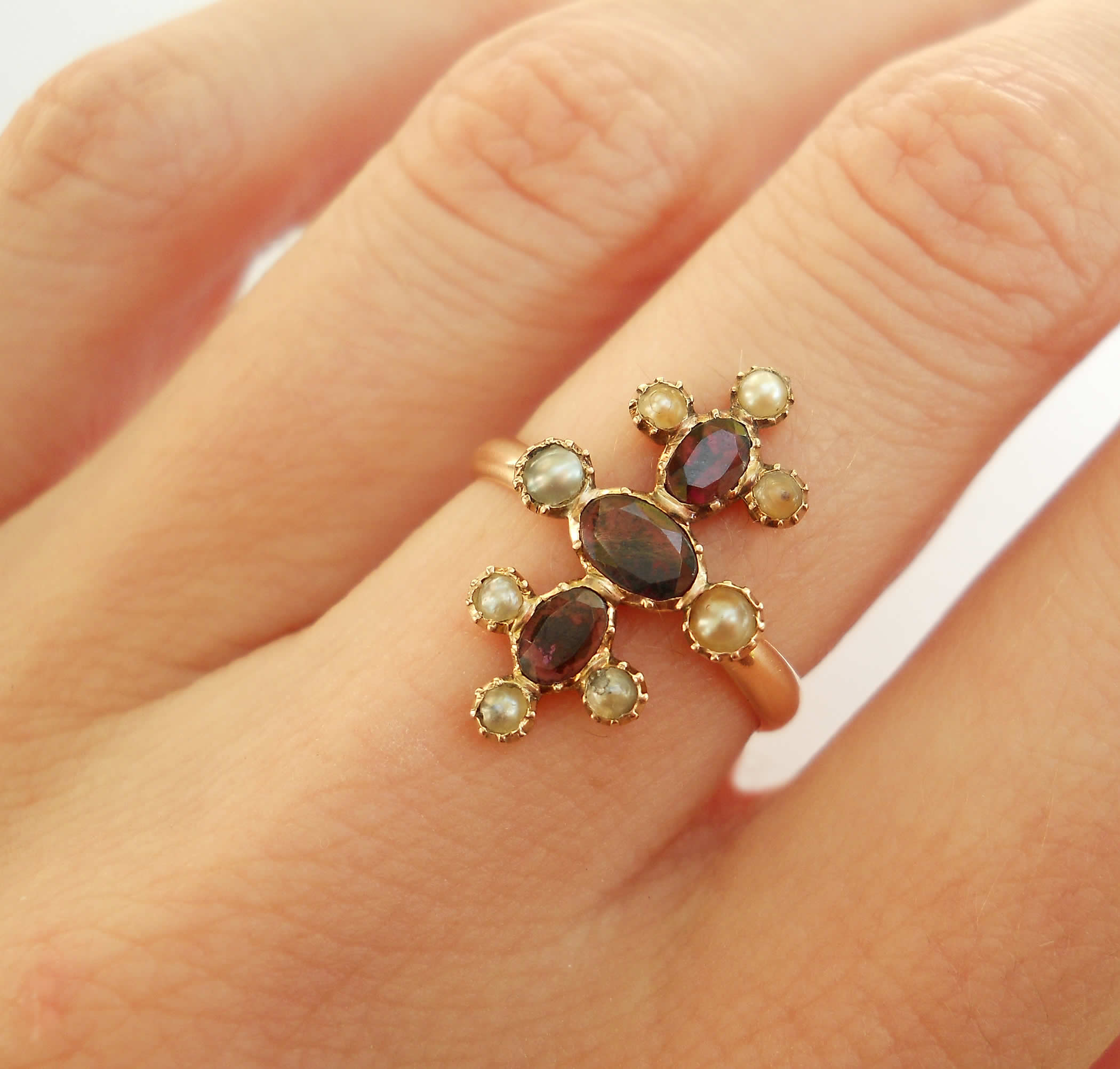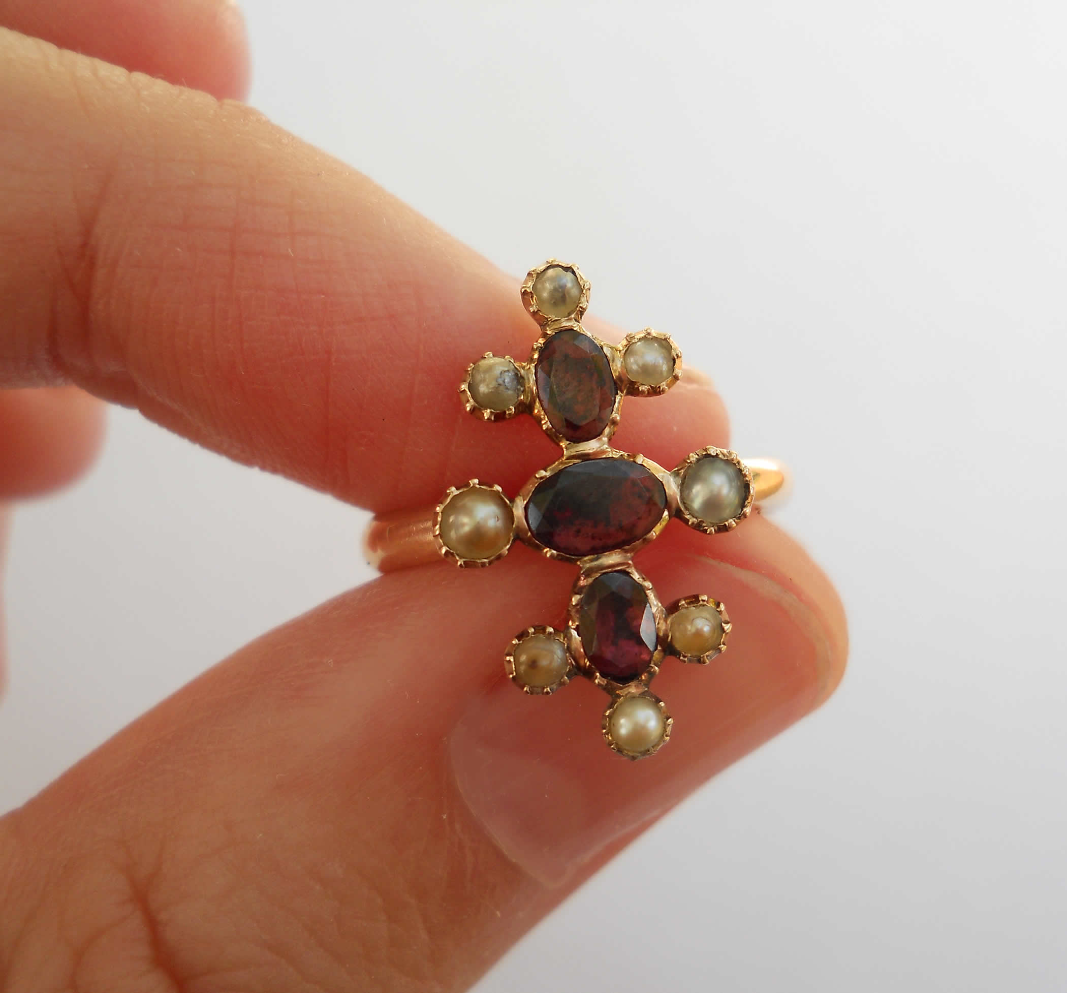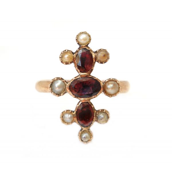 This special, one of a kind piece has been made from the sweetest original 15ct gold lace pin of circa 1800. It is set with three foiled, flat cut garnets all tipped with tiny natural seed pearls in a fascinating historical style. Charmingly the seed pearls vary in colour, being more ivory in tone to one end and more of a warm, light champagne hue to the other. One has a very sweet little ‘beauty mark’ to its centre – this, we believe, occurred naturally in the pearl and has been set in the piece for interest. The garnets do show a bit of age-related wear in their foils, but this is just a delightful piece all round. The former brooch has been beautifully smoothed to the reverse and precision set to an unmarked 9ct gold band of 2.7mm width. The top of the ring measures around 18.7 x 11.9mm, and sits with a flat, low profile on the hand.