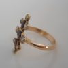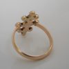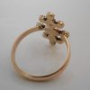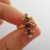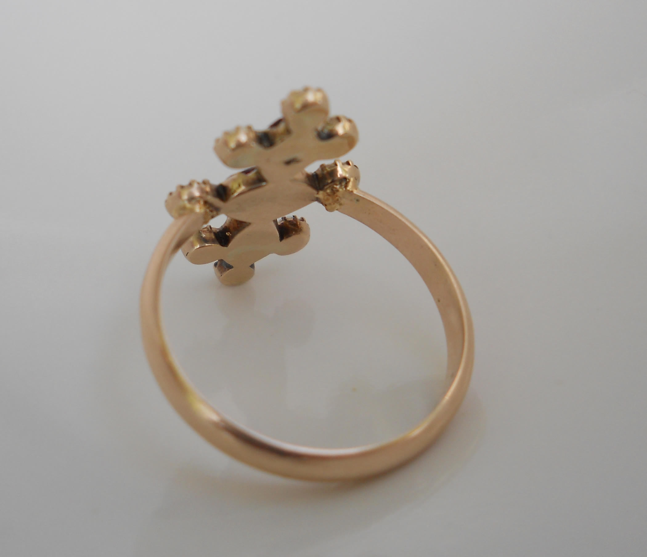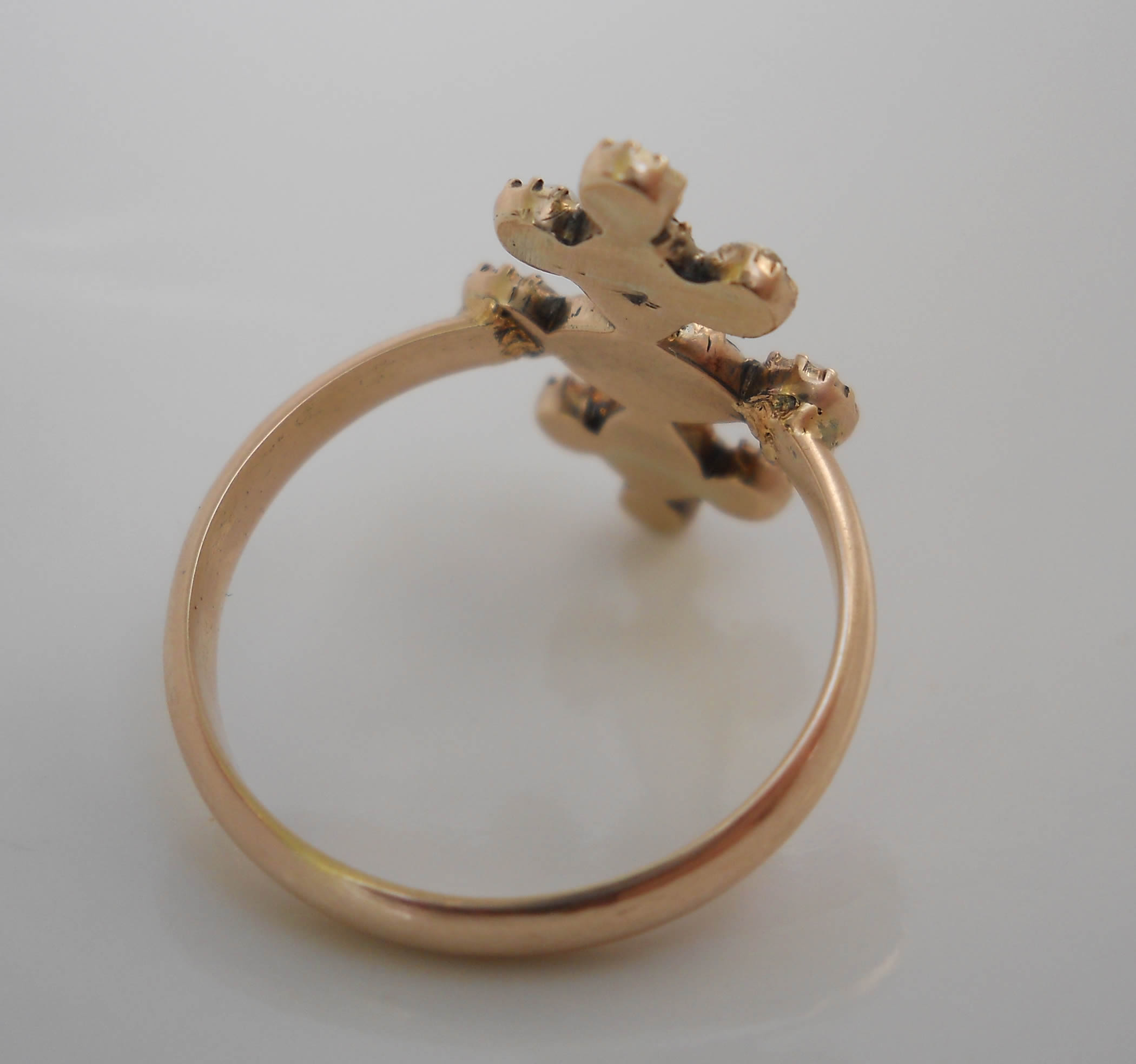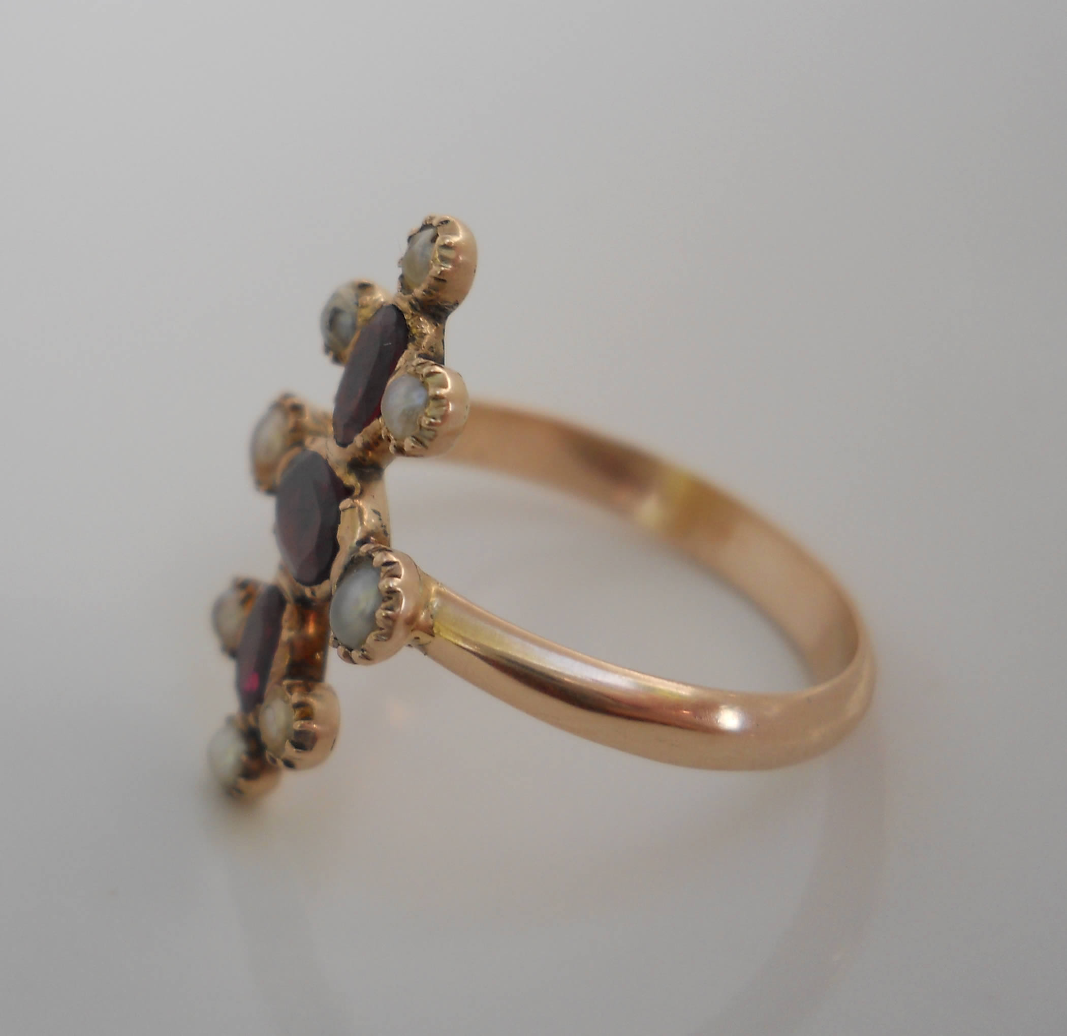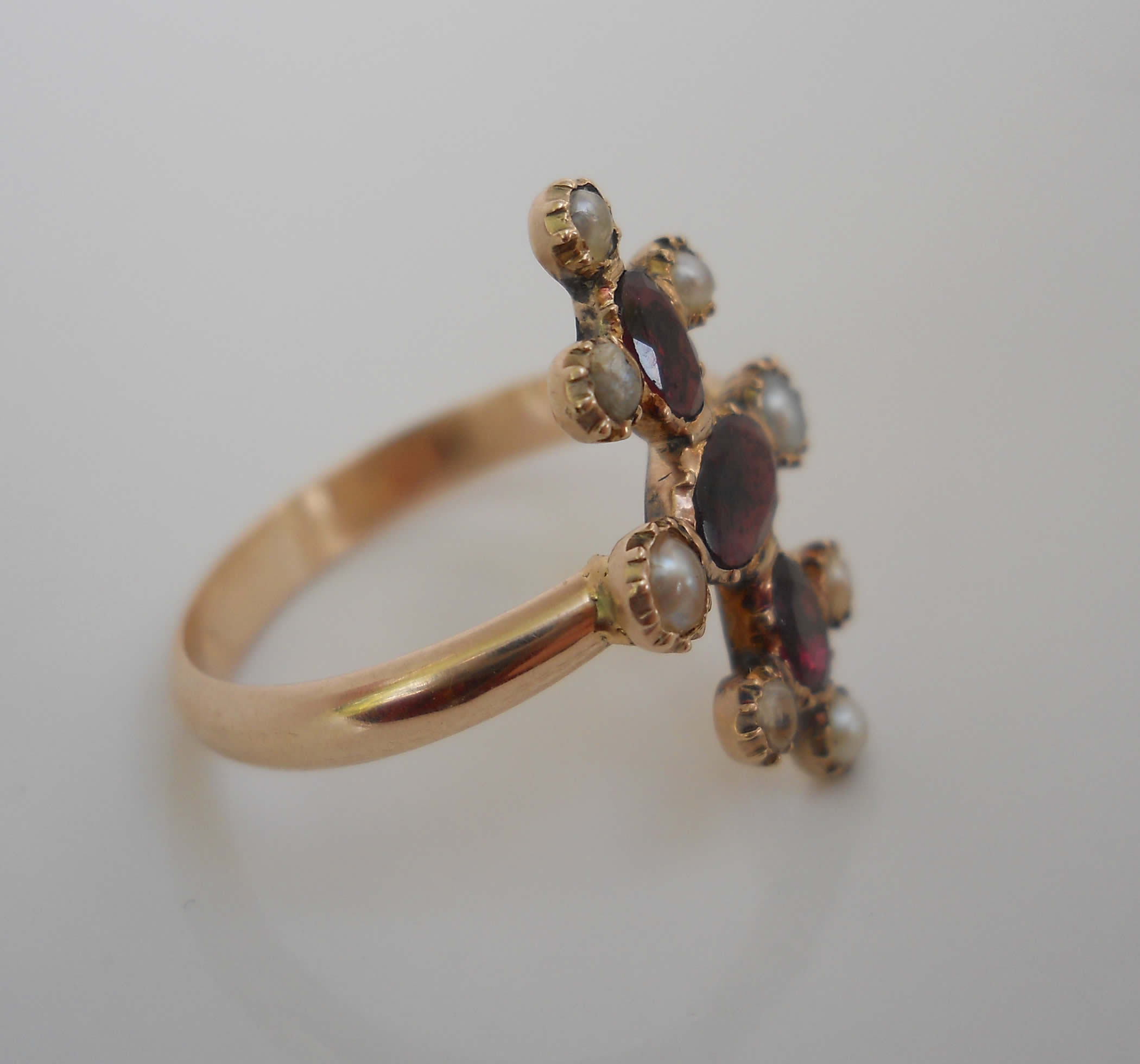 This special, one of a kind piece has been made from the sweetest original 15ct gold lace pin of circa 1800. It is set with three foiled, flat cut garnets all tipped with tiny natural seed pearls in a fascinating historical style. Charmingly the seed pearls vary in colour, being more ivory in tone to one end and more of a warm, light champagne hue to the other. One has a very sweet little ‘beauty mark’ to its centre – this, we believe, occurred naturally in the pearl and has been set in the piece for interest. The garnets do show a bit of age-related wear in their foils, but this is just a delightful piece all round. The former brooch has been beautifully smoothed to the reverse and precision set to an unmarked 9ct gold band of 2.7mm width. The top of the ring measures around 18.7 x 11.9mm, and sits with a flat, low profile on the hand.