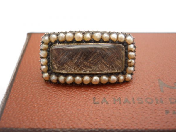 A delicate example of a Georgian mourning jewel, this tiny brooch is set with thirty natural ivory colour seed pearls that shine with a fascinating hint of blue. Blonde-brown hair has been fastidiously braided and encapsulated under a pane of glazed crystal; it is perfectly preserved after two hundred years, a testament to the sentiment behind these very special pieces of jewellery. The brooch is cased in pale yellow gold. Original back pin and ‘C’ clasp is in perfect working order and the piece can certainly still be worn. This is a genuine piece of high quality, collectible Georgian jewellery.