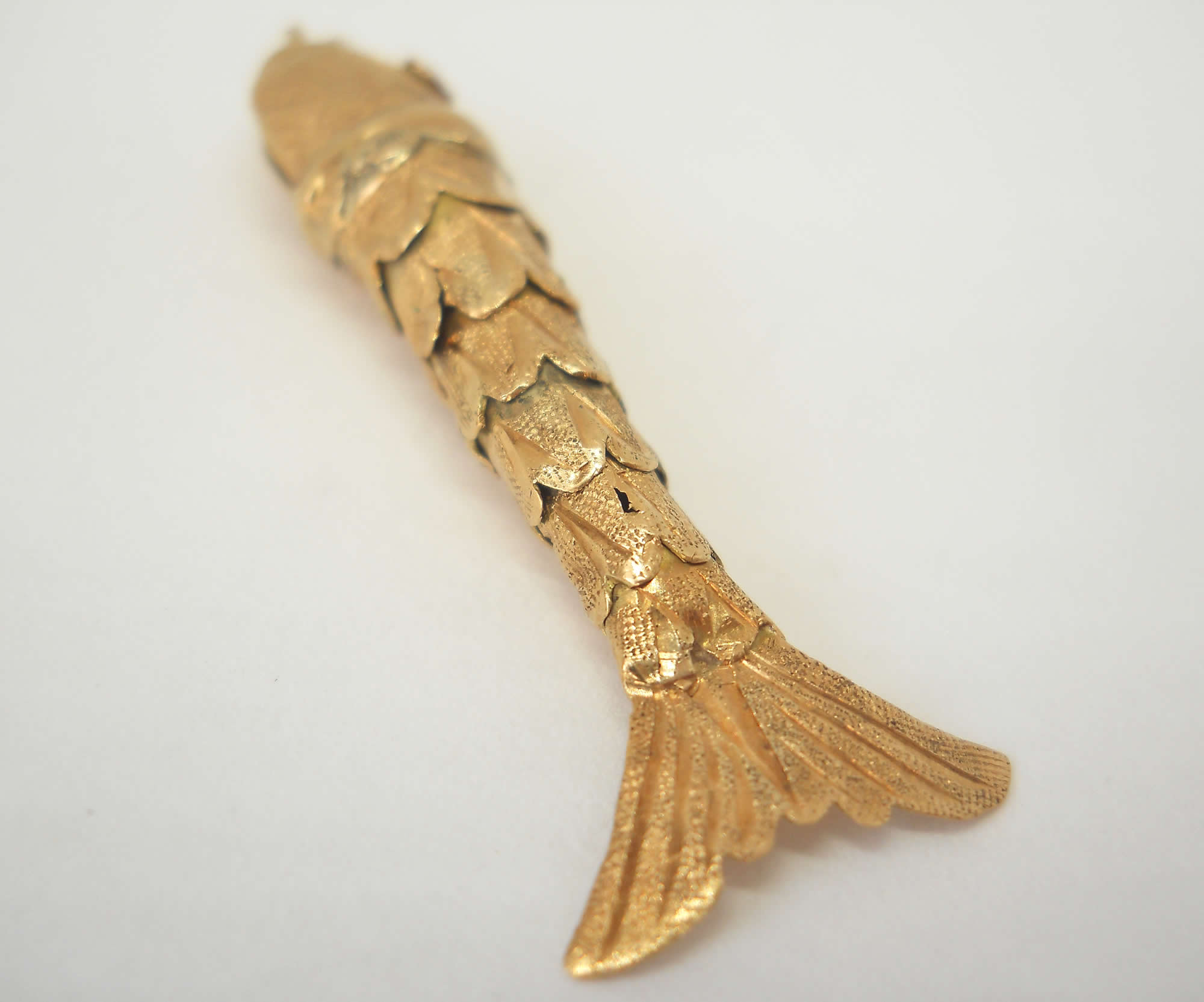 The articulated fish made in precious metal is a motif that originated in old Chinese culture, where it symbolised the wish for more of what one desires: luck, wealth or children, for example. The fish were first made as vinaigrettes, their heads opening to hold perfumed cotton, protecting the owner from the malodours of inner city life. Eventually the moving fish was adopted as a jewellery motif and scaled down to be worn as a charm.