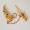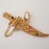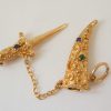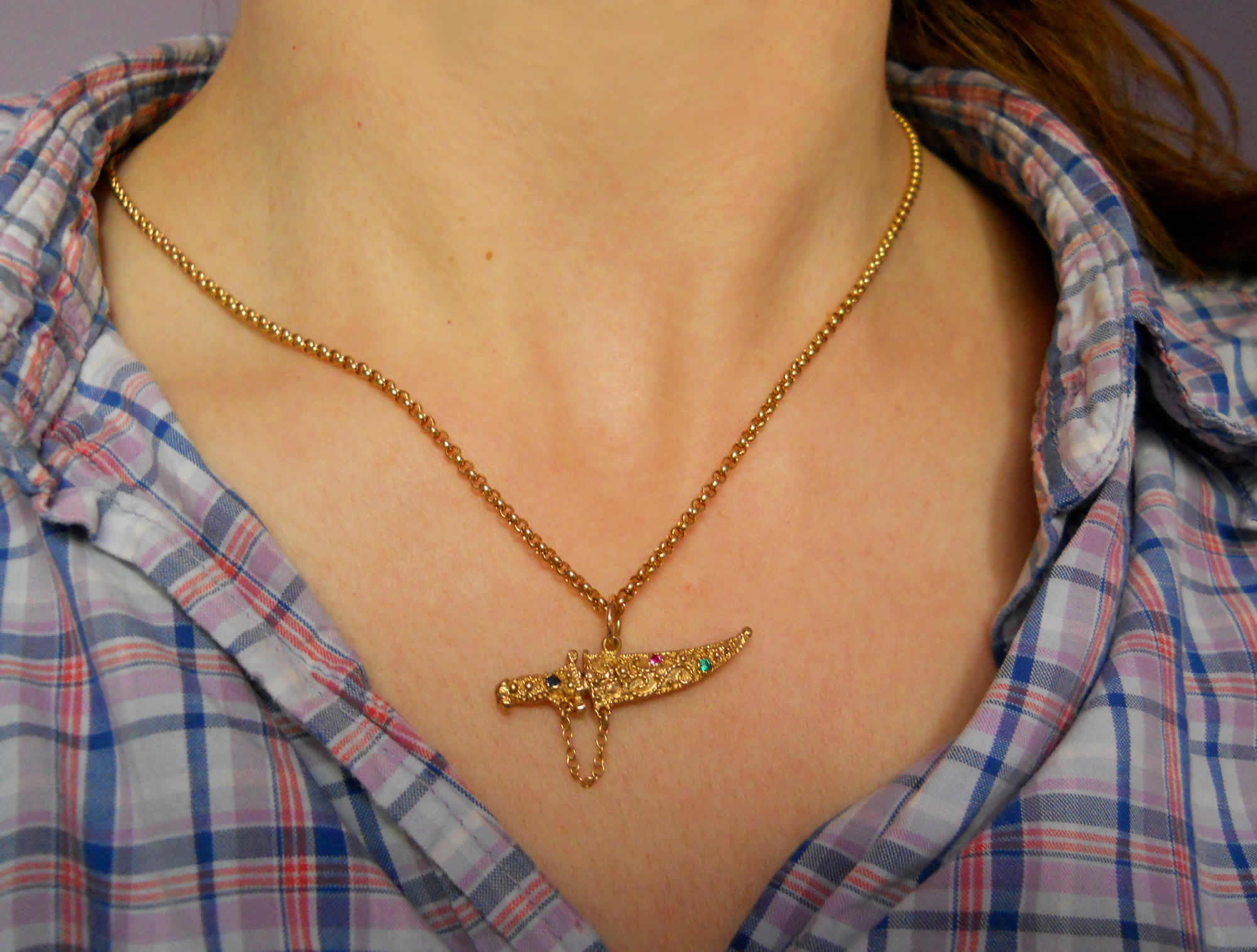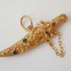 This opulent charm reveals a pointed dagger from its jewelled sheath. Even the hilt of the dagger is set with a beautiful gemstone. It looks wonderful hung with other charms, or worn by itself on an old gold chain, and will make an amazing talisman. The length is approximately 3.6cm.