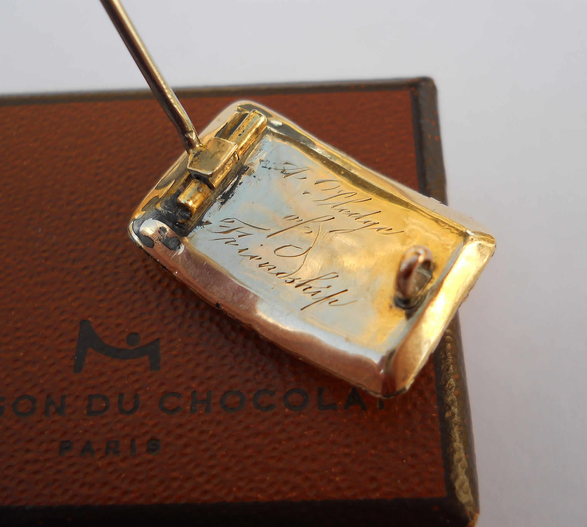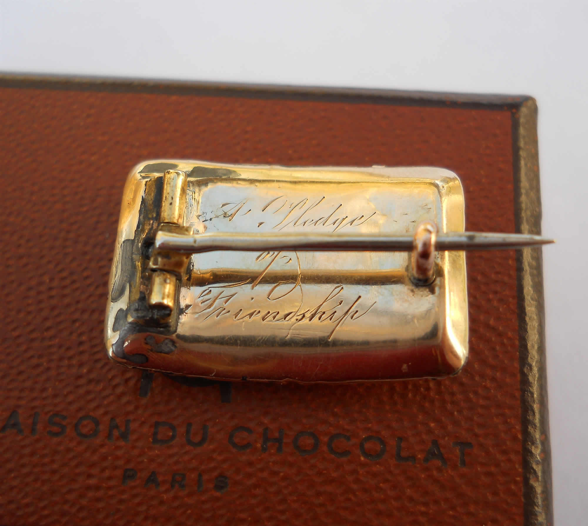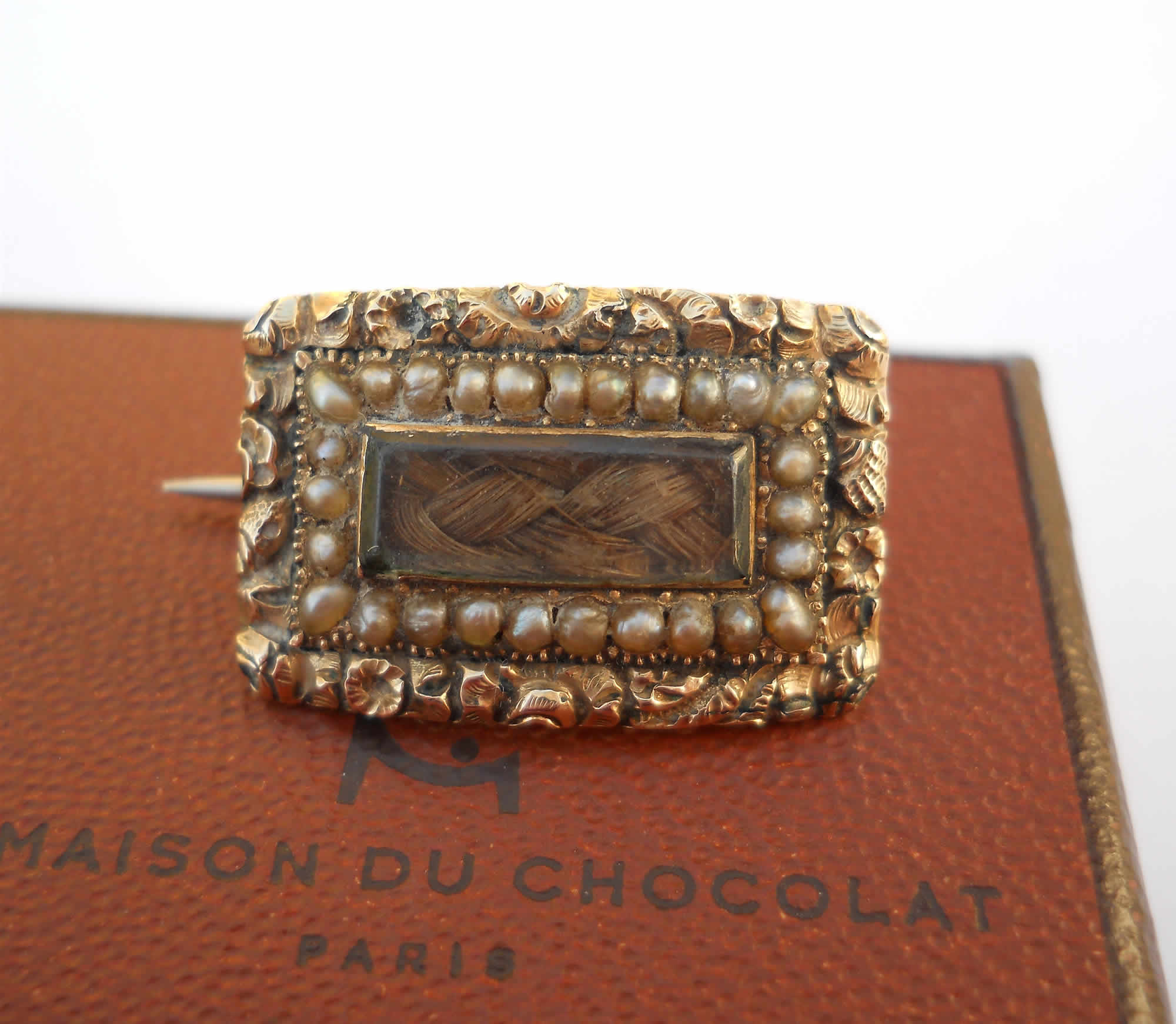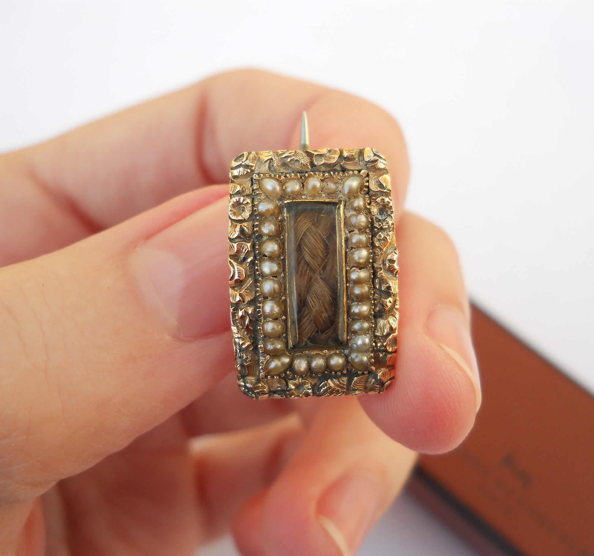 A truly sweet little brooch with a bevelled glazed panel of hair work at its centre, framed by a border of tiny ivory seed pearls. A further border of ornate gold work makes this piece a little object of art. It depicts a carved floral motif that speaks to the neo-classical sentiment of the era. To the reverse a white metal pin and original ‘C’ clip are in good working order. An inscription in beautiful Engrosser’s Script reads, “A Pledge of Friendship”, so interestingly, this is not a mourning piece, as one might expect, but rather a token of amity. It was likely worn every day by a young Georgian lady, on her lace, and put away each night in her jewellery box. It measures 14.2 x 21.2mm. The pin is around 22mm and extends a little further.