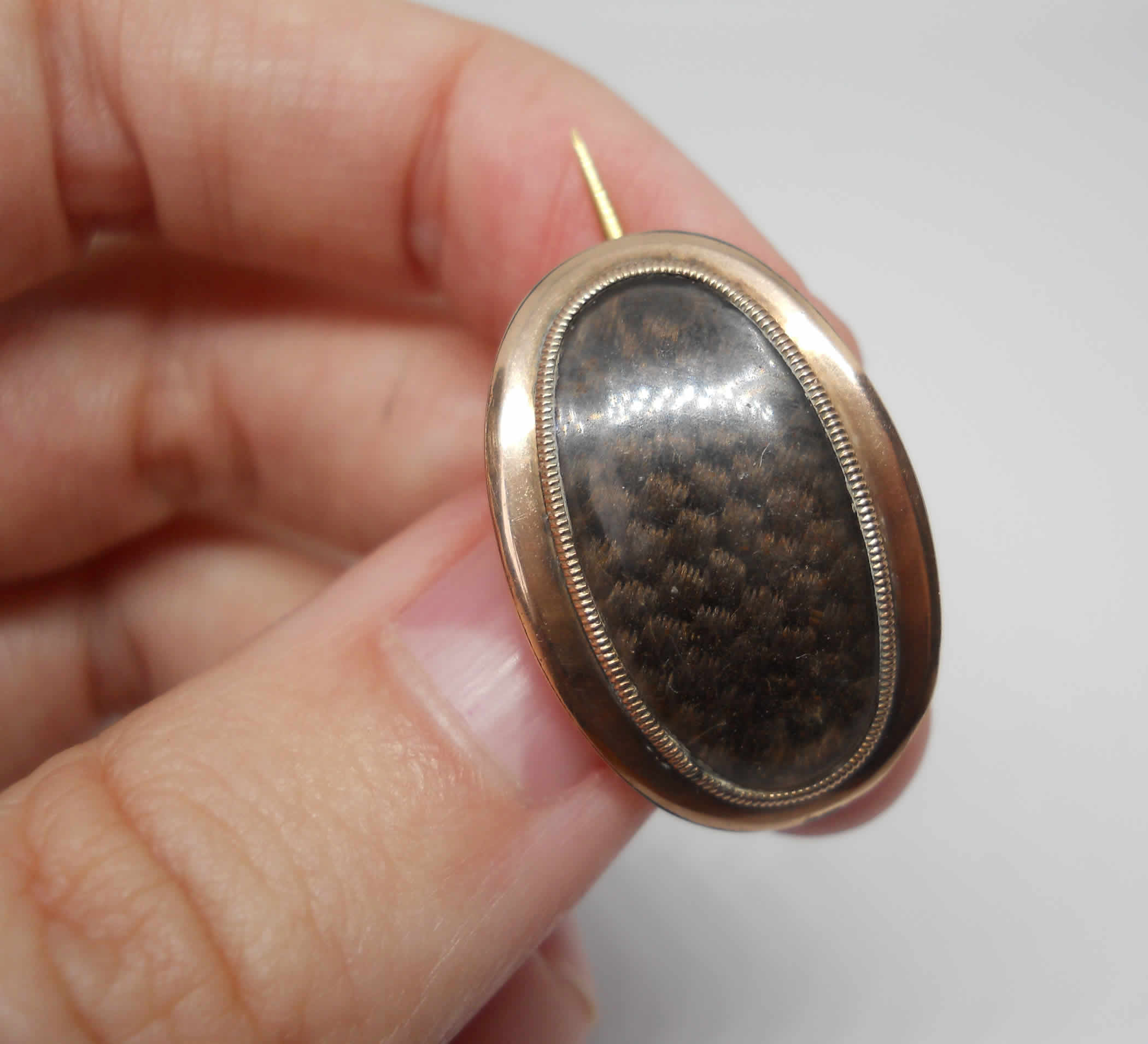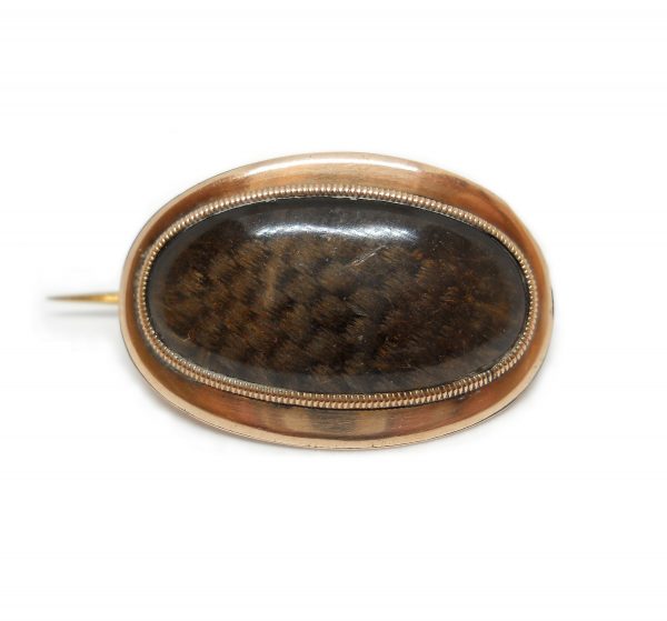 A splendid mourning brooch containing the most beautiful woven hair under a thick panel of glass. It is set in wonderful rose gold and is curved, smooth and chunky. It has its original ‘C’ clasp and a yellow gold pin (very sharp!). The brooch is around 12.1 x 26.3mm; the pin is 30.3mm. The condition is very nice with only minor wear to the surface of the glass. An historical piece of true quality.