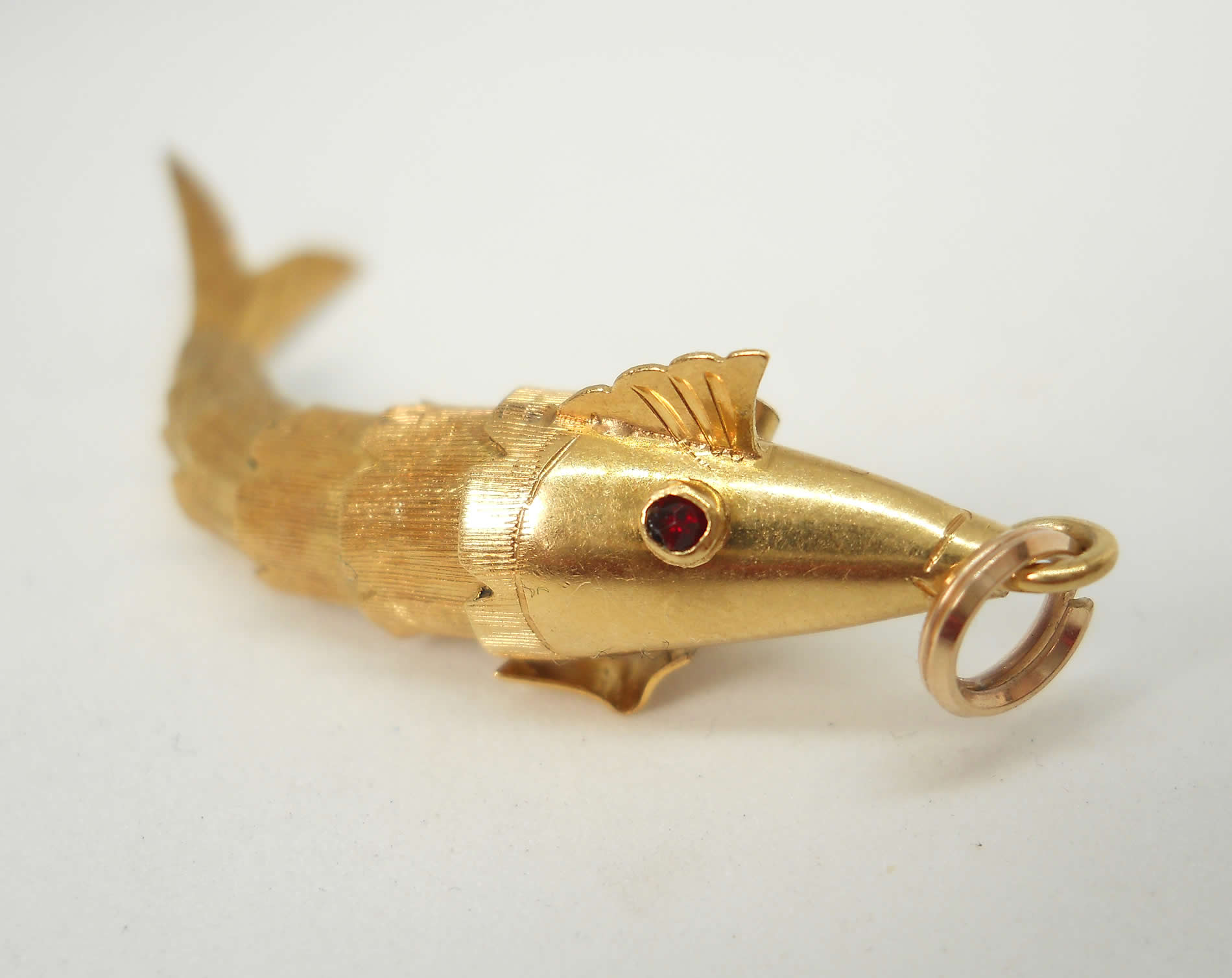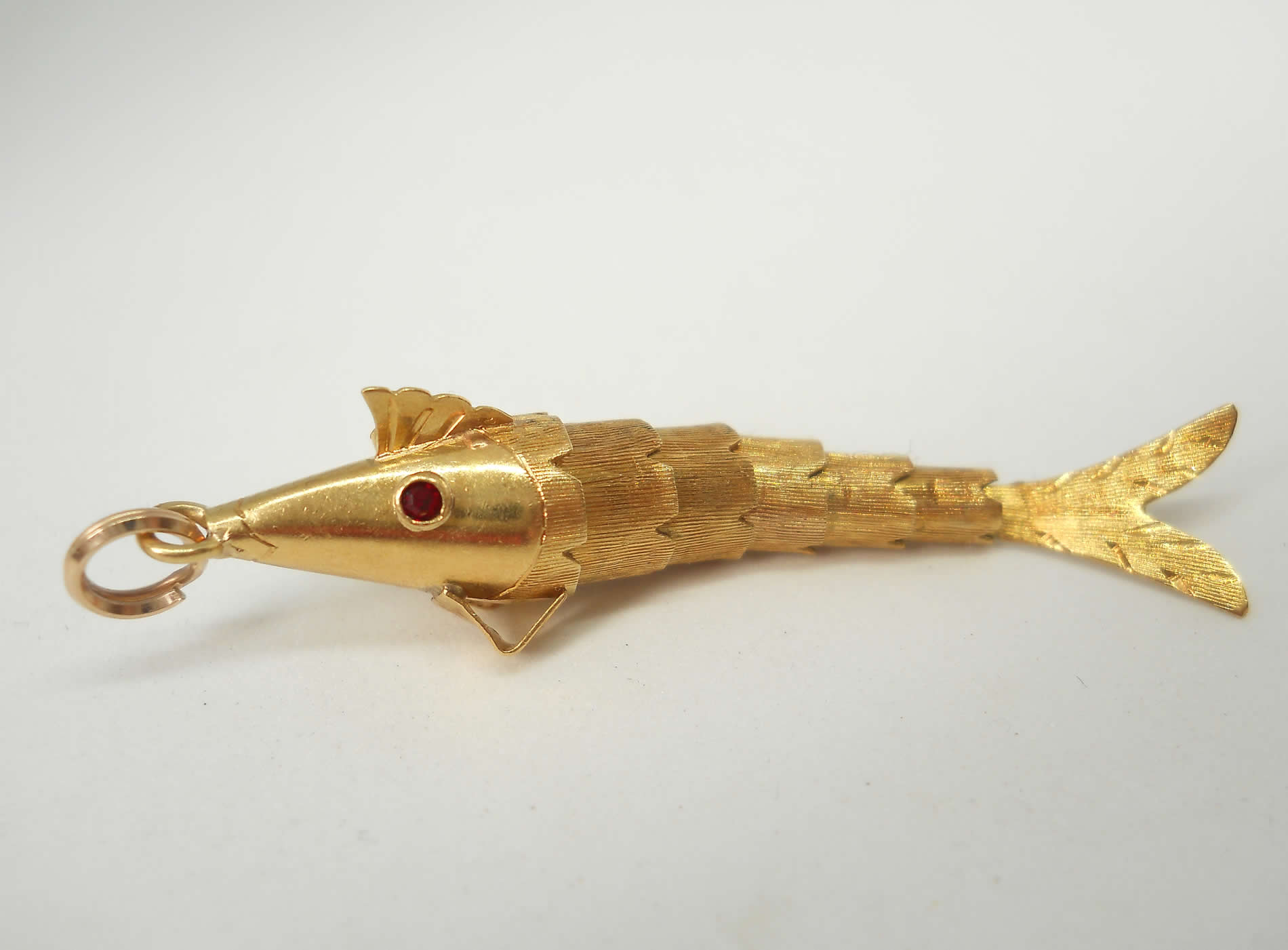 This buttery yellow gold example has a wonderful fluidity of movement, with striking barracuda-like pointed facial features. The eyes are set with red gemstones, likely synthetic garnets. He can sit up on his little fins and has a cute doral fin on top of his head. We have added a 5mm 9ct gold split ring allowing him to be placed on your chain. His tail is a little bent with age but quite acceptable. The scales are all finely etched for a realistic sinuous look. The head is smooth.