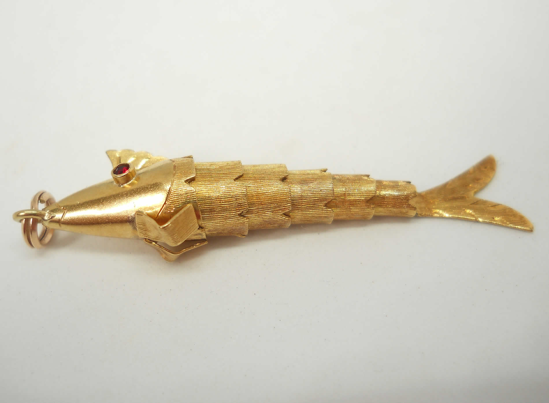 The articulated fish made in precious metal is a motif that originated in old Chinese culture, where it symbolised the wish for more of what one desires: luck, wealth or children, for example. The fish were first made as vinaigrettes, their heads opening to hold perfumed cotton, protecting the owner from the malodours of inner city life. Eventually the moving fish was adopted as a European jewellery motif and scaled down to be worn as a charm.